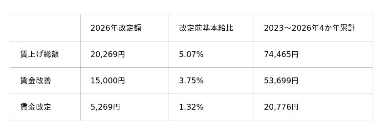 賃金改善は2023年から4年連続となり、4か年累計の賃金改善は 53,699 円となります。加えて、人的資本の最大化に向けて福利厚生や教育訓練などの総合的な処遇改定も合わせて実施いたします。