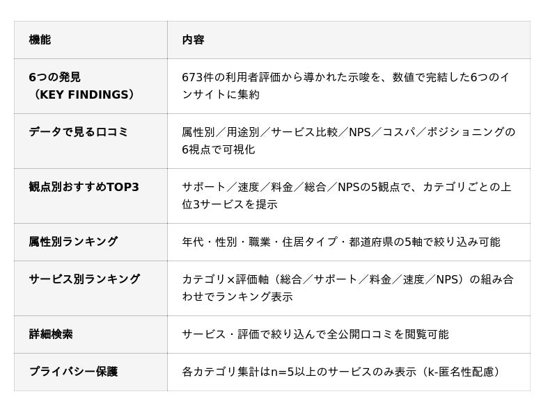 このほか、観点別TOP3(サポート/速度/料金/総合/NPS)、年代・性別・職業・住居タイプ・都道府県別の満足度ランキング、全公開口コミの閲覧(詳細検索対応)を公開しています。