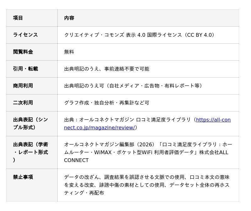 本ライブラリの口コミ・集計値・ランキングは、すべてCC BY 4.0で公開しています。出典を明記いただくだけで、記事・レポート・プレゼンテーションへの引用、グラフ作成・独自分析などの二次利用、自社メディアや広告物・有料レポートへの商用利用のいずれも、事前連絡なくご活用いただけます。具体的な条件は以下のとおりです。