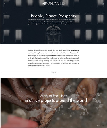 このウェブサイトは、企業活動に関する広く包括的な情報を提供するために、コンテンツはPeople(人)、Planet(地球)、Prosperity(活動)という3つの主要セクションに分かれています。各セクションでは、ビデオとテキストによって、企業としての一貫性、時代性、流動性、快適性、権限委譲、サステナビリティ、規律、独立性、信頼性、そして「Less is more」というアルマーニ グループの価値観を説明しています。