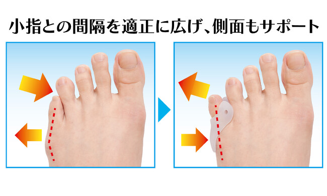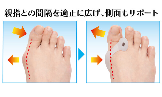 本品を付けると指の間が広がり、足指の角度が自然に緩やかになり、歩行をラクラク快適に。