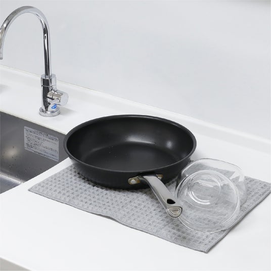 布巾の上に『フライパンスタンド』を置いて乾かせば、フライパンを独立させてスピーディーに乾かせます。
