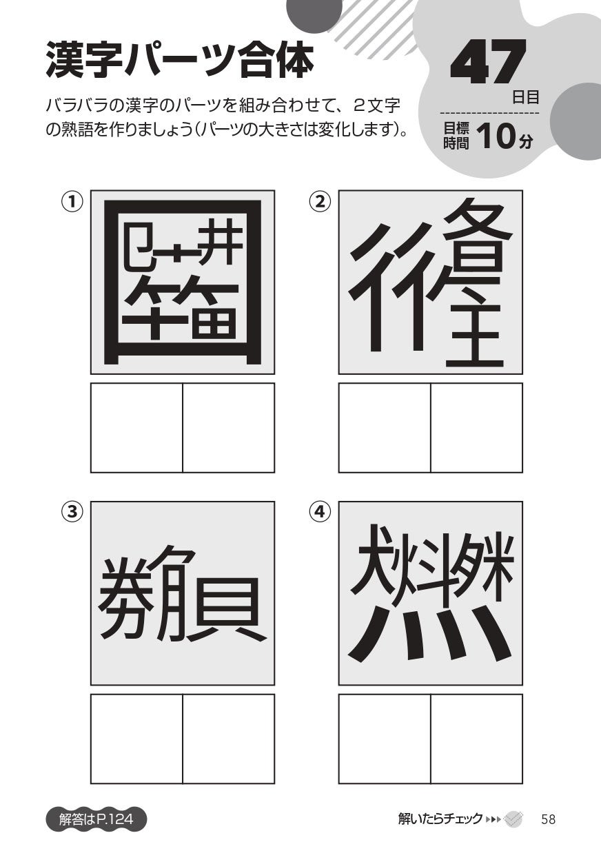 バラバラになっている漢字のパーツを組み合わせて漢字を作ることで、漢字の思い出しや創造する力が鍛えられます。