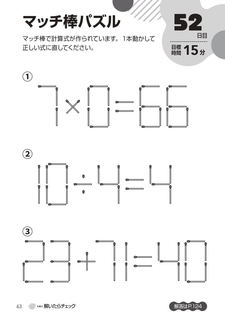 指定された本数のマッチ棒を移動したり追加して正しい式に。四角い頭を丸くして解きましょう。