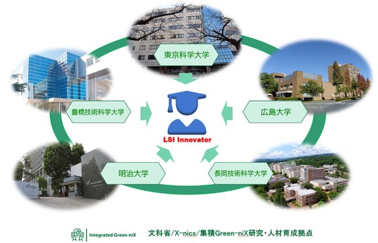 単位互換覚書は、集積Green-niX(グリーンニクス)研究・人材育成拠点(用語1)の活動の一環として、将来半導体業界を牽引するLSI Innovator(エル・エス・アイ・イノベータ、用語2)の卵を育成することを目的としています。今回、締結した参加覚書は、2024年1月1日に東京科学大学(締結当時:東京工業大学)、豊橋技術科学大学、広島大学の3大学間で締結していた覚書の対象大学を、5大学へ拡張するものです。本参加覚書の締結により、対象となる学生は、4月から新規参入の2大学での開講科目を加えて拡張されたGreen-niX対象科目(用語3)を所属大学の垣根を越えて履修(遠隔の大学から座学の講義をオンライン受講可能)し、自身が所属する大学の単位として取得できるようになります。今回、新たに明治大学、長岡技術科学大学が加わることで、Green-niX対象科目の相補性が向上し、LSI Innovatorに求められる網羅的な基礎知識や高度な専門知識の学修効果がより一層高まることが期待されます。