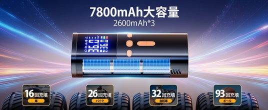 本製品は大容量7800mAhのリチウム電池を搭載しており、約2時間でフル充電が可能です。1回のフル充電で、自転車タイヤに30回、バイクタイヤに32回、車用タイヤに36回、ボール用タイヤに9回対応できます。さらに、内蔵のターボコンプレッサーは毎分25,000回転の高性能モーターを採用し、わずか10秒で車のタイヤに空気を充填できます。パワフルな性能と長寿命設計により、長期使用に最適です。
