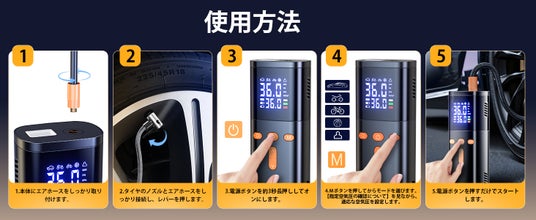 付属の5種類のエアノズルにより、アメリカ、フランス、イギリス規格のバルブに対応。自転車やバイク、車はもちろん、ボールや浮き輪などの様々なアイテムにも対応できます。さらに、車モード、バイクモード、自転車モード、カスタムモードといった5つのモードが搭載され、用途に応じた柔軟な調整が可能です。