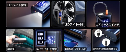 LEDディスプレイにより、空気圧の数値、電池残量、使用モードが一目で確認できます。また、Type-C充電ポートと5V/2A出力ポートが搭載されており、スマートフォンの充電も可能。アウトドアや緊急時にも活躍します。