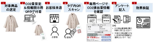 対象ブランドの店頭商品にCO2排出量情報を確認できる二次元コード記載のタグをつけ、その情報を閲覧した消費者によるアンケート結果や売上データなどを基に、購買行動への変容を検証します。