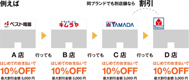 2019年9月14日(土)~2019年9月30日(月)の期間中、ヤマダ電機、ベスト電器、マツヤデンキ、ツクモ、キムラヤでの各店舗初回のお支払いが10%OFFとなります。