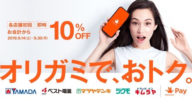 株式会社Origami(本社:東京都港区、代表取締役社長:康井義貴、以下「Origami」)と、株式会社ヤマダ電機(本社:群馬県高崎市、代表取締役社長:三嶋恒夫、以下 「ヤマダ電機」)及びヤマダ電機グループ会社のベスト電器、マツヤデンキ、ツクモ、キムラヤは、2019年9月14日(土)~2019年9月30日(月)の期間、キャンペーンを実施します。期間中、Origami Payで各店舗初めてのお支払いが即時で10%OFF(最大3,000円割引)となります。クーポンをセットする必要がなく、Origami Payでお支払いするだけで自動的に割引となります。また、同一店舗での2回目以降のお支払いは、お会計金額からいつでもその場で即時3%OFFとなります(※)。