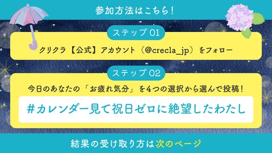 祝日が一度もない6月は、梅雨による気圧の変化や天候の不安定さも重なって、心もからだも疲れを感じやすい季節。そんな時季にこそ、暮らしに寄り添うサービスをお届けするクリクラとして、ほんのひと息つける“安らぎ”と、ふっと笑顔になれるような“やさしさ”を届けたい--そんな想いで、自分の“お疲れサイン”に寄り添う診断型キャンペーンを開催いたします。