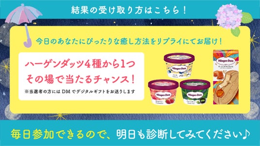 本キャンペーンでは、その日の“お疲れ気分”に合わせて癒しのヒントをお届けするほか、セブン-イレブンで引き換えられる「ハーゲンダッツ4種から1つ」がその場で当たります。お疲れ気分に寄り添うメッセージと、その場で当たる小さなご褒美で、6月の日々にささやかな癒しをお届けします。