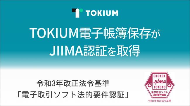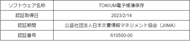 株式会社TOKIUM(本社:東京都千代田区、代表取締役:黒崎 賢一、以下 当社)は、文書管理クラウド「TOKIUM電子帳簿保存」が、公益社団法人 日本文書情報マネジメント協会(以下 JIIMA)が認証する「 電子取引ソフト法的要件認証」を取得したことをお知らせします。