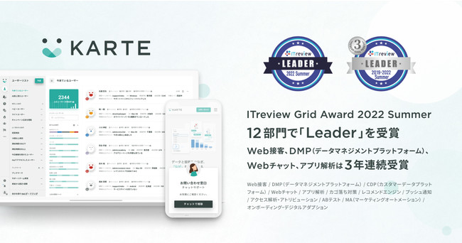 株式会社プレイド(東京都中央区:代表取締役CEO 倉橋健太)の提供するCXプラットフォーム「KARTE」が、アイティクラウド株式会社(東京都港区:代表取締役社長 黒野源太)運営のIT製品レビュープラットフォーム「ITreview(アイティレビュー)」において満足度・認知度ともに優れた製品であると評価され、「ITreview Grid Award 2022 Summer」の12部門にて「Leader」を受賞しました。