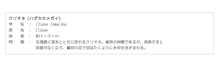 「クリオネ」は、巻貝の仲間で貝殻をもたず、翼のような「翼足」(よくそく)で泳ぐ愛らしい姿から「流氷の妖精」として親しまれています。