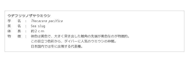 黄色い体色に黒の模様が可愛らしい「ウデフリツノザヤウミウシ」、ピンク色でひらひらと漂う深海魚「ザラビクニン」など、個性的な生きものが登場!寒い冬ならではの海の生きものをお楽しみください。