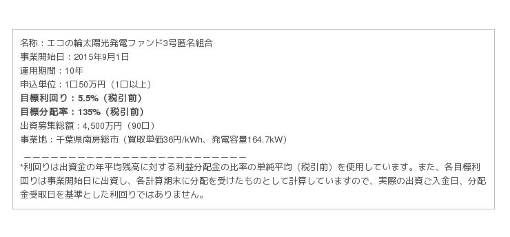 ■手数料等について:お申込時に手数料はいただきません。ただし、出資金の払込みに係る銀行振込手数料はお客様の負担となります。また、持分の譲渡時には譲渡手数料として譲渡口数に関わらず金5,000円(税別)、また出資金の払込みが遅延し契約解除された場合は解約手数料として申込金額の6%(税別)をお支払い頂きます。なお、出資者は出資金から出資対象事業に要する費用等を間接的に負担し、その中には株式会社エコスタイルの事業利益となるものが含まれます。