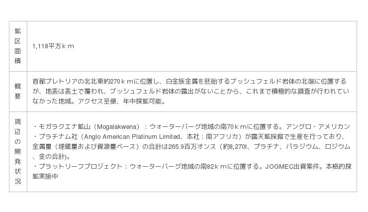○JOGMEC、南アフリカ共和国の白金族金属プロジェクトで金属量約315tを確認(2013年4月16日発表)