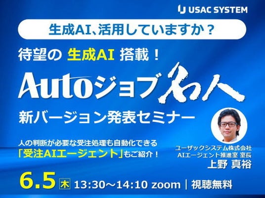 ユーザックシステム株式会社(本社:大阪市中央区、代表取締役社長:小ノ島 尚博)は、当社が開発・提供するRPAツール「Autoジョブ名人」の新バージョンリリースに伴い、2025年6月5日(木)にオンライン発表セミナーを開催いたします。