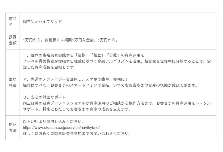 岡三証券株式会社(所在地:東京都中央区、代表者:取締役社長 江越誠、以下「岡三証券」)とウェルスナビ株式会社(所在地:東京都渋谷区、代表者:代表取締役CEO 柴山和久、以下「ウェルスナビ」)は、本日、個人のお客さまを対象とした資産運用サービス「岡三Naviハイブリッド」の提供を開始いたしました。