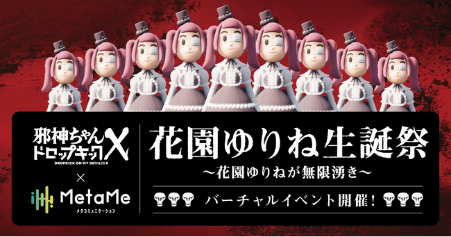 「MetaMe」内のイベント広場で人気キャラクター「花園ゆりね」の生誕祭が開催決定。バーチャル空間内では、ゆりねが邪神ちゃんをおしおきするシーンだけを上映。さらにプレイベントでゲット出来る「花園ゆりね」オリジナルアバターを着用して、イベント広場中央に設置される「邪神ちゃん像」の周りをサークルモッシュしたり、集合写真を撮ったりして、みんなで盛大にお祝いしましょう!