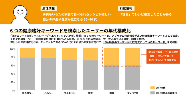 今回は来店客層も踏まえ、メインとなるターゲットは「自分の体型や健康を意識している30~40代」とし、その像に近しいユーザーのレシピ嗜好を分析しました。アプリ内では比較的「タンパク質」「糖質」のキーワードでレシピを検索することが多いことから、タンパク質を多く含む食材を活用しながらも糖質を抑えることを意識。また、同ユーザーがお気に入りしているレシピの傾向を鑑みて、シンプルな味付けでありながら食べ応えのある料理になるようレシピを開発しました。