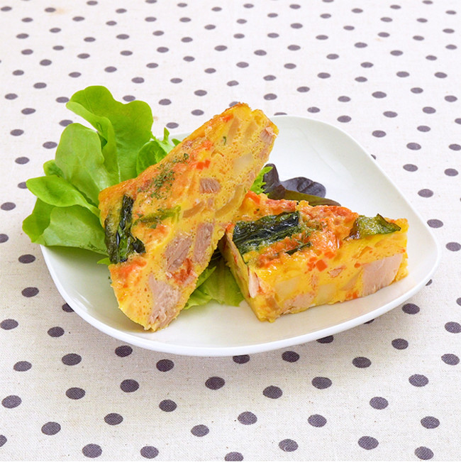 シーチキン、卵、チーズなどたんぱく質を多く含む食材を使ったオムレツです。トマト、玉ねぎ、にんじん、じゃがいも、ほうれん草の5種類の野菜を使い、1食で満足感のあるおかずに仕上げました。シンプルな味付けのため、老若男女問わず多くの方にお召し上がりいただける、主菜にも副菜にもぴったりな1品。
