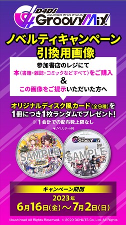 日本出版販売株式会社(代表取締役社長:奥村 景二、略称:日販)は、株式会社ブシロード(代表取締役社長:木谷 高明)が展開するメディアミックスプロジェクト「D4DJ」とコラボレーションし、2023年6月16日(金)より全国397書店にて、商品ご購入時にオリジナルディスク風カード(全9種)がもらえるノベルティキャンペーンを開始します。
