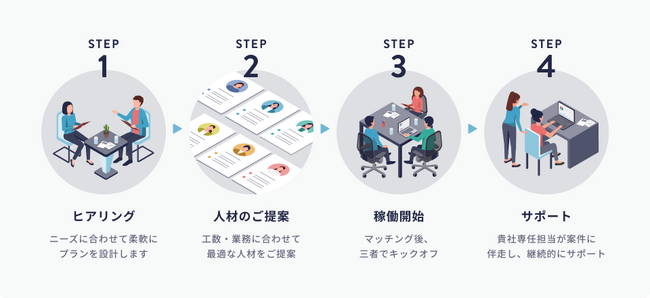 SHE担当社員が、SHE人材と企業の間に入って伴走することで、採用初期から定着・活躍するまでのプランニングやディレクションを一手に引き受けます。人材採用から定着までの期間で負担となるオンボーディンや育成、業務改善のフィードバック、稼働工数管理、人材の不安解消などのサポートを通して、人材がより企業にフィットしたスキルを発揮できるようにします。