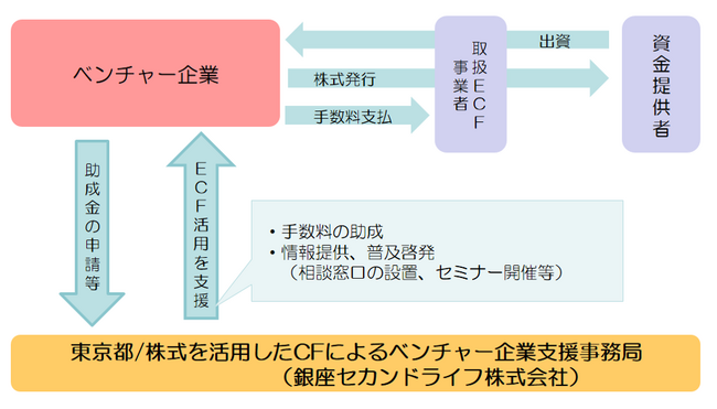 ベンチャー企業の株式投資型クラウドファンディング(以下「ECF」)の活用を支援することで、HTT※2・ゼロエミッション※3やDXの推進等、新しいビジネス等への挑戦を促進するとともに、ECFの普及を図ることを目的とした東京都による事業です。