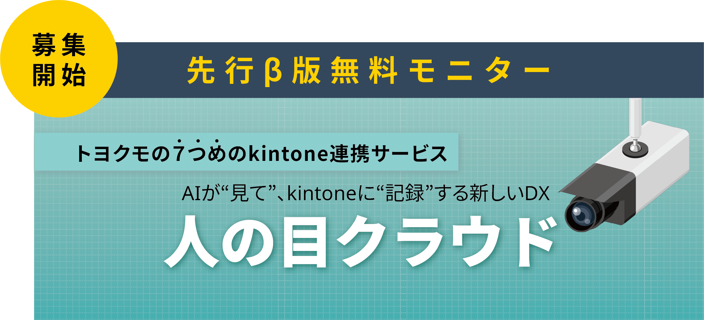 - 応募方法:β版はこちらからお申し込みください。 (注:本モニターのご利用には、kintoneのご契約が必須となります。)https://contents.kintoneapp.com/tkalp-hitonome_cloud