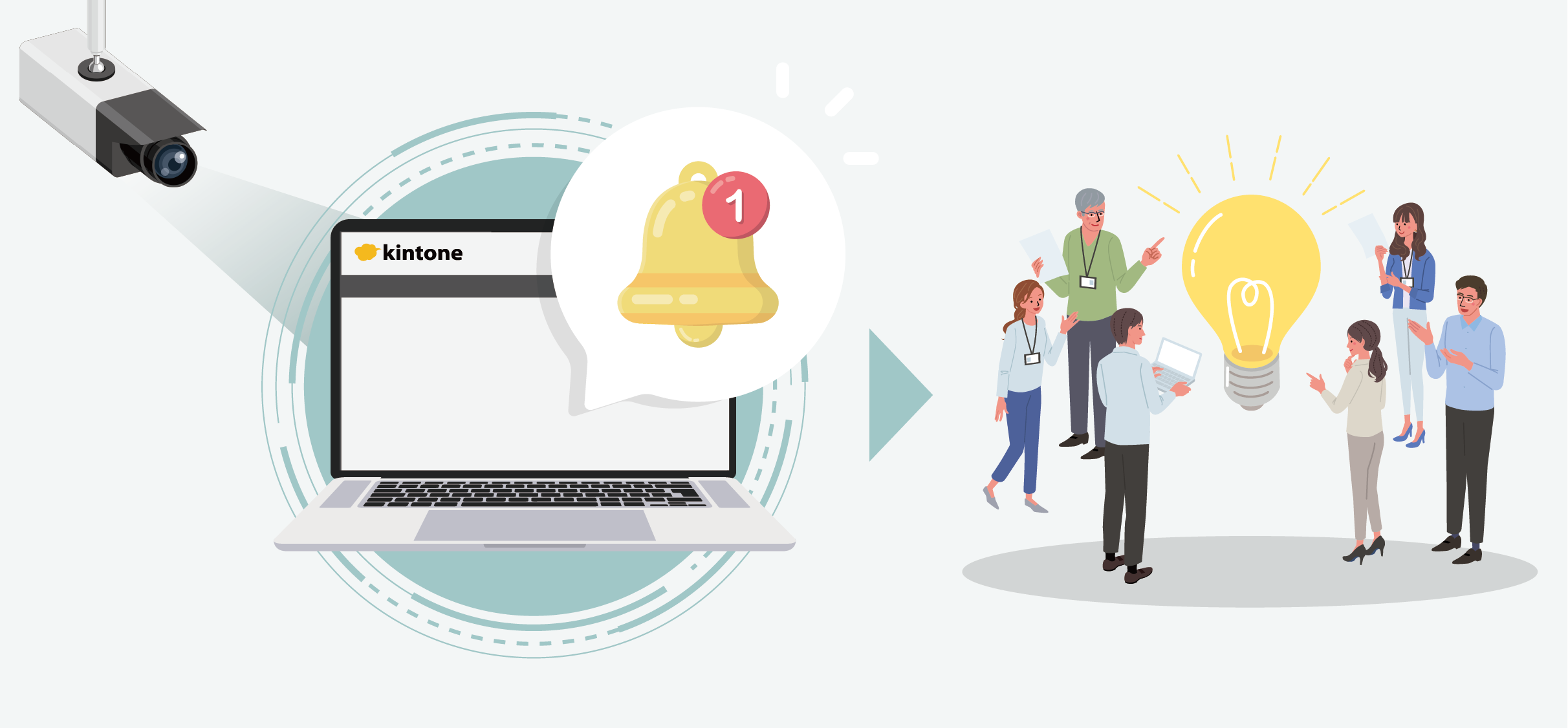 「人の目クラウド」は、AIがウェブカメラ映像から異常や重要な動きをリアルタイムに検知し、業務プラットフォームkintoneへ自動で即時通知するサービスです。