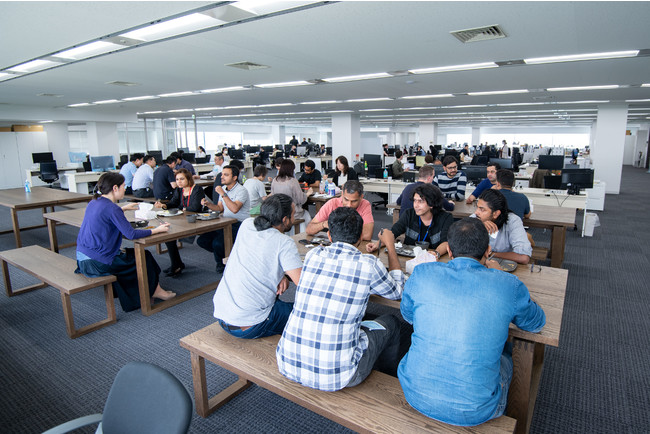 ランチをしながら自然と会話が生まれるように、細長い大きなテーブルを設置。ランチタイムは全ての社員の垣根がない、フラットに話せる時間に。美味しい食事を食べながら会話をしていると新しいビジネスアイディアが生まれたり、普段業務で関わらないメンバーとのコミュニケーションのきっかけになったりすることもあり、貴重な空間になっています。またすぐそばに緑いっぱいの公園が見える大きな窓があり、自然を見て癒されながらランチをすることができます。