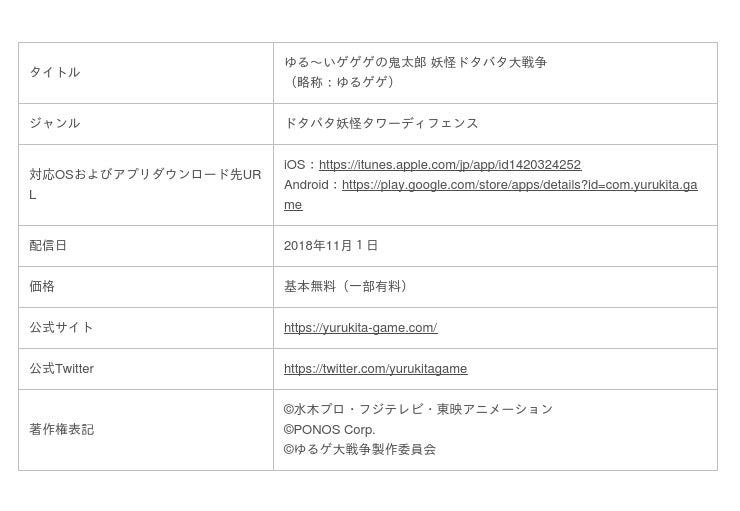 ゆるゲ大戦争製作委員会(配信・企画:東映アニメーション株式会社、企画・開発・運営:ポノス株式会社)は、人気アニメ『ゲゲゲの鬼太郎』を題材としたスマートフォン向けゲーム『ゆる~いゲゲゲの鬼太郎 妖怪ドタバタ大戦争』(略称:ゆるゲゲ)におきまして、超激レア確定ありの限定レアガチャ「極ゲゲゲ祭」および、限定キャラクターが手に入る10月イベントやお得なアイテムセールの開始をお知らせいたします。
