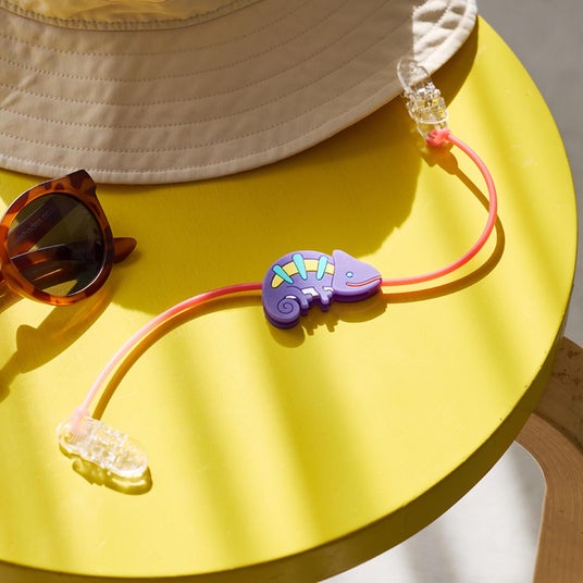 紫外線に当たると色が変わる!帽子をかぶるタイミングをお子さまに視覚的に伝えることができるハットクリップです。長い舌がチャームポイントのカメレオンと、D by DADWAYで人気のベアをモチーフにした2種類展開。帽子と洋服をつなぐことで紛失を防ぐハットクリップは、帽子のあご紐が苦手なお子さまにもおすすめです。