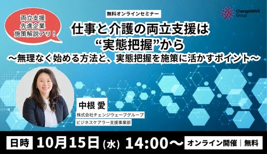 仕事と介護の両立支援を行う株式会社チェンジウェーブグループ(本社:東京都港区、代表取締役社長/CEO:佐々木裕子)は、2025年10月15日(水)に無料オンラインセミナー「仕事と介護の両立支援は”実態把握”から~無理なく始める方法と、実態把握を施策に活かすポイント~」を開催いたします。