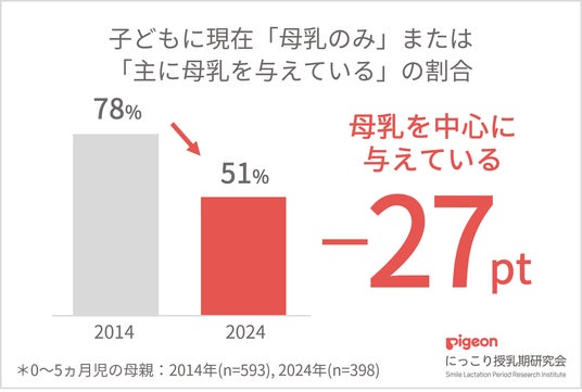 ピジョン株式会社(本社:東京都中央区、社長:矢野 亮)は、当社と専門家によるプロジェクト「ピジョン にっこり授乳期研究会」の活動として、授乳期におけるママの意識や現状を明らかにするため、「授乳期母子状況調査」を実施しました。一部結果には2014年におこなった調査(※1)から2024年までの10年間の変化を含み、全国の20~44才の女性計20,000人のうち、第一子妊娠中の妊婦447人と、子どもが1人で生後3才未満など条件に合致する母親1,558人の回答を抽出しました。