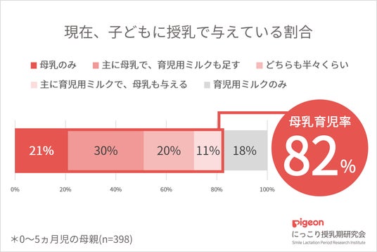 0~5ヵ月児の母親の82%が子どもへ母乳を与えており、母乳育児率(「育児用ミルクのみ」以外を選択した割合)は高い結果となりました。