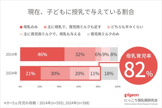 0~5ヵ月児の母親の82%が現在子どもへ母乳を与えており、母乳育児率は高い結果に。一方で、前回調査と比較すると、「母乳のみ」と回答した割合は25ポイント減少した。