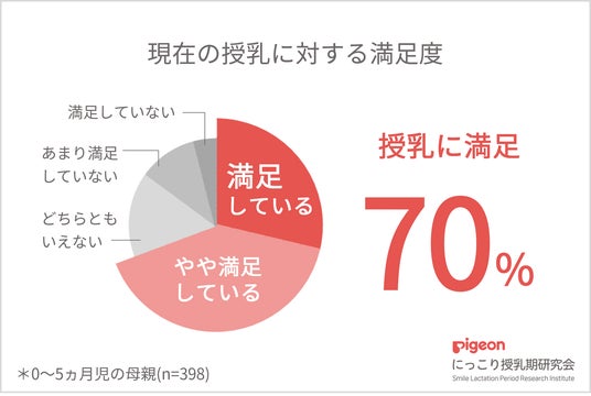◎ 授乳に対する母親の満足度:母親の70%が満足している 「お子さんへの授乳に対して、現在どの程度満足していますか」の設問には、0~5ヵ月児の母親の70%が、現在の授乳に「満足している」「やや満足している」と回答。授乳に対して満足している母親が多い結果となりました。