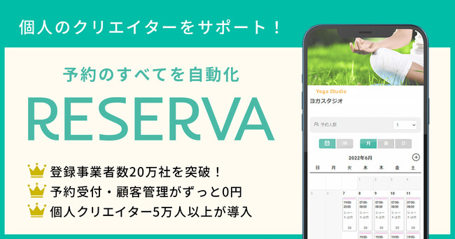 RESERVA(https://reserva.be/)は、ヘアサロン、ホテル、旅館、スクール、イベント、レンタルスペース、医療機関など20万社以上で導入。個人のクリエイターもサポート!