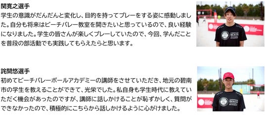今回の「AKTIO アンダーエイジ・ビーチバレーボール・アカデミー」vol.9では、現役のプロビーチバレーボール選手とプロコーチが、部活動でビーチバレーボールやインドアのバレーボールに取り組む中学生・高校生を対象に、試合での戦略や戦術、コンビネーション、勝利への考え方などについて実践形式で指導を行いました。練習試合を通じ、プロから直接アドバイスを受けることで参加した生徒達にとって貴重な経験となりました。