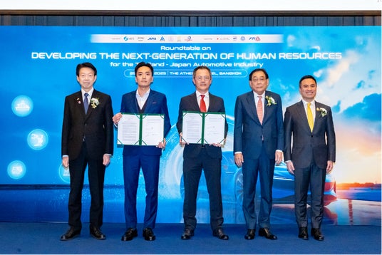 MOU締結式の様子(左から:武藤容治 経済産業大臣(日本政府)、鈴木慎太郎(Managing Director & Head of APAC Regional Business, Zeroboard (Thailand) Co., Ltd.)、鈴木克周(Director、ROJANA INDUSTRIAL PARK PUBLIC CO., LTD.)、ピチャイ副首相兼財務大臣(タイ王国政府)、エカナット工業大臣(タイ王国政府))