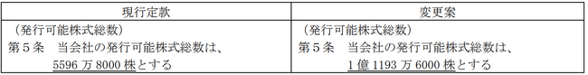 今回の株式分割に伴い、会社法第184条第2項の規定に基づき、2024年6月1日をもって、当社の定款第5条の発行可能株式総数を変更いたします。