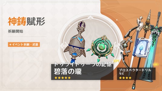 期間中、限定★5武器「法器・トゥライトゥーラの記憶」、「法器・碧落の瓏」などの出現率が大幅にUPします。