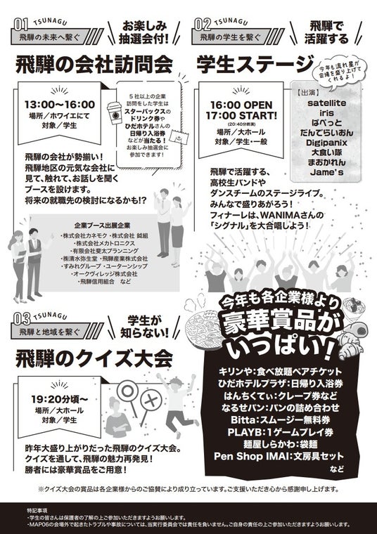 イベント開催に必要な資金も、高校生たちが地元企業73社を訪問し、協賛金を集めることで実現。これを機に、「飛騨の企業訪問会」を実施し、飛騨地域の企業がブースを出展。中・高校生と企業の直接対話の場を設け、地元企業の魅力を発信します。