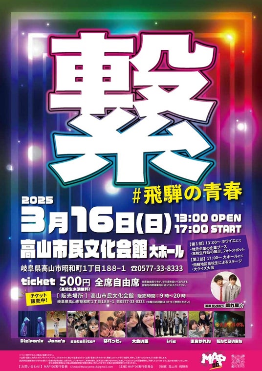 令和7年3月16日(日)、岐阜県高山市の高山市民文化会館にて、高校生が主体となる地域活性化イベント「MAP06 繋#飛騨の青春」が開催されます。このイベントは、地元高校生12名で構成される高山市公認市民団体「MAP実行委員会」が主催、高山市・飛騨市が後援する注目の地域イベントです。開催を通じて地域と若者の新たなつながりを生み出し、ふるさとを誇れる場所にすることを目指します。