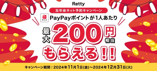実名口コミのグルメ情報・予約サイト「Retty(レッティ)」を運営するRetty株式会社(本社:東京都港区、代表取締役:武田 和也)は、「Retty忘年会ネット予約キャンペーン」を2024年11月1日(金)から12月31日(火)まで開催することを決定しました。期間中に対象店舗をRettyでネット予約すると、通常時の2倍のPayPayポイント(一人当たり最大200円相当)を来店後に進呈します。