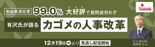 累計13,000社420万人以上の組織開発・人材育成を支援するALL DIFFERENT(オールディファレント)株式会社(所在地:東京都千代田区 代表取締役社長:眞崎大輔)は、2024年6月27日(木)に、カゴメ株式会社 常務執行役員 兼 カゴメアクシス株式会社 代表取締役社長 有沢正人氏をお招きし、「『人的資本経営』を目指し毎年進化するカゴメの人事制度 ~真の意味での経営戦略と人材戦略の連動とは~」というテーマでスペシャルセミナーを開催しました。参加した経営者・人事担当者の99.0%が「期待通り・期待以上」と回答した本セミナーを、2024年12月19日(木)より期間限定で無料配信いたします。